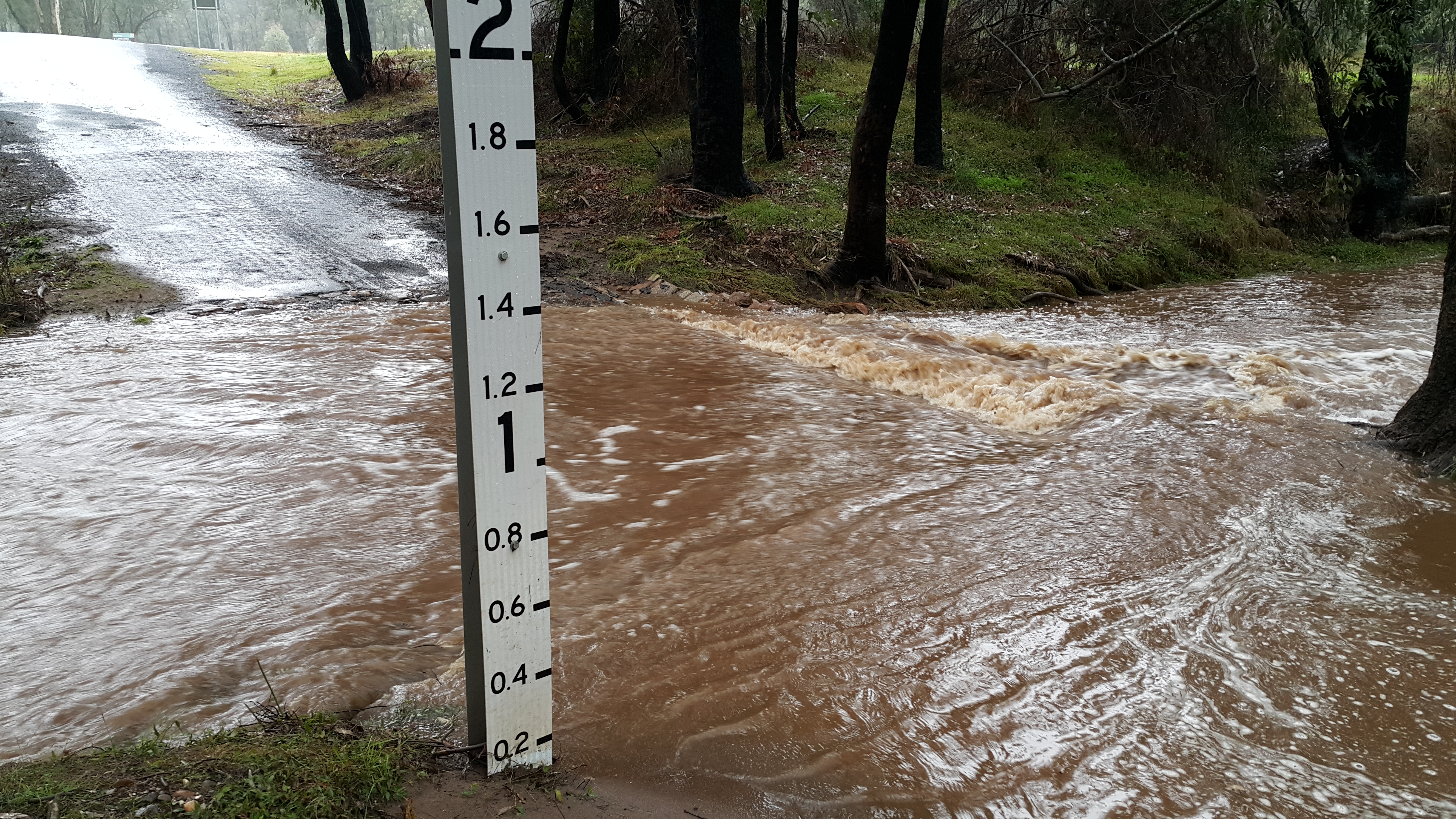 On the road towards the park visitor centre, the rain got heavier as we continued past the entrance to Siding Springs, thinking we would take a tour of the observatory on the way back from our walk. If nothing else, we thought, at least we could take a look at the visitor centre, pick up some maps, and decide on something that would be manageable despite the weather conspiring against us. Half way along the short road that turns off the main road towards the centre, we crossed a small creek that was decidedly swollen. The water was safely rushing through the large pipes of the white concrete ford. But a little further along we were thwarted by a lower crossing on the same creek, which didn’t seem to be so well-prepared. Although the gauge suggested there were only 10 centimeters or so of water flowing over the road, and despite the visitor centre being visible in the clearing on the other side, we didn’t feel at all confident that our low-slung 2WD Odyssey would make the trek across, and more particularly, back again should the creek rise further. It was becoming clear this was not going to be a day for a simple picturesque hike.