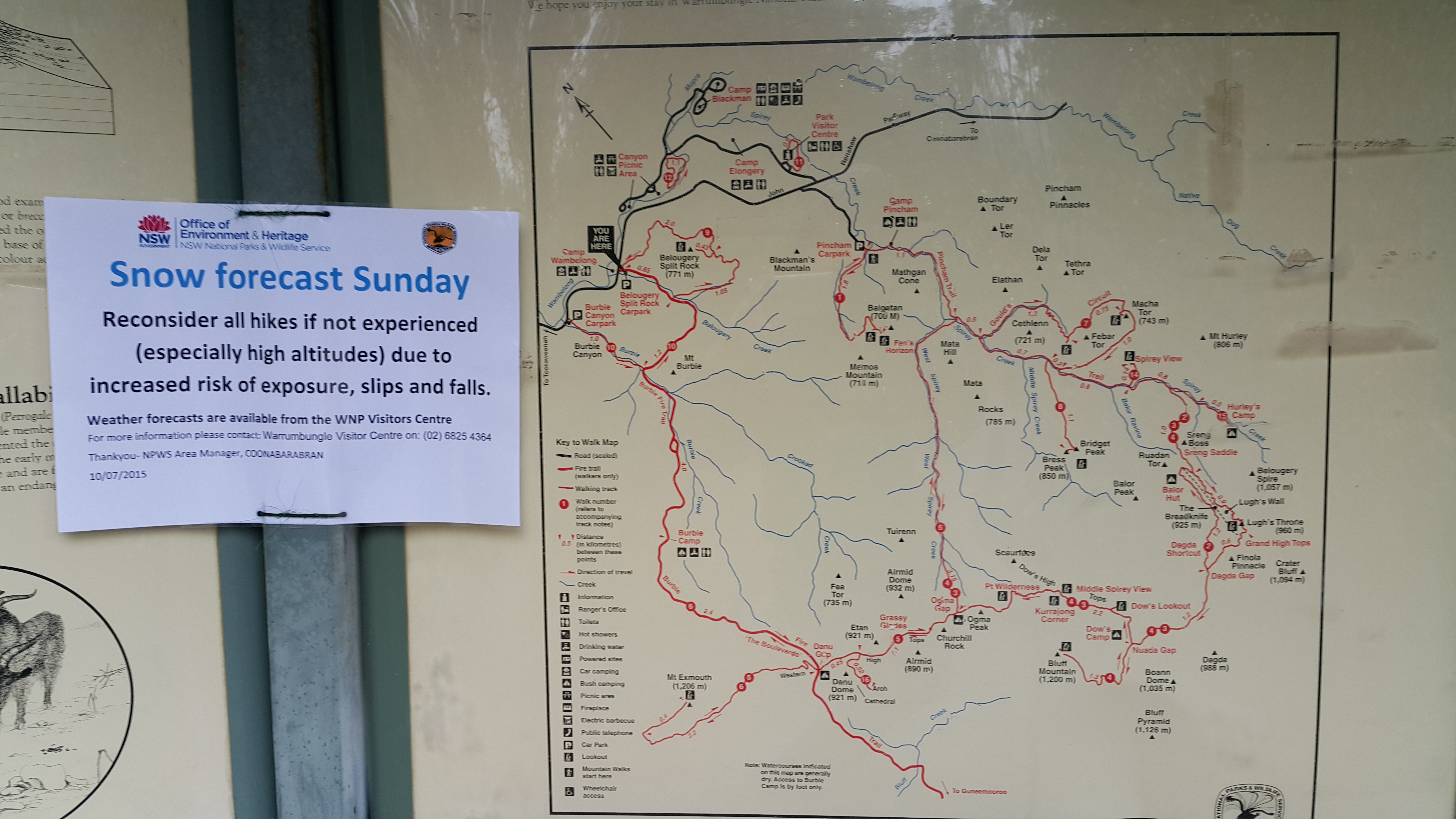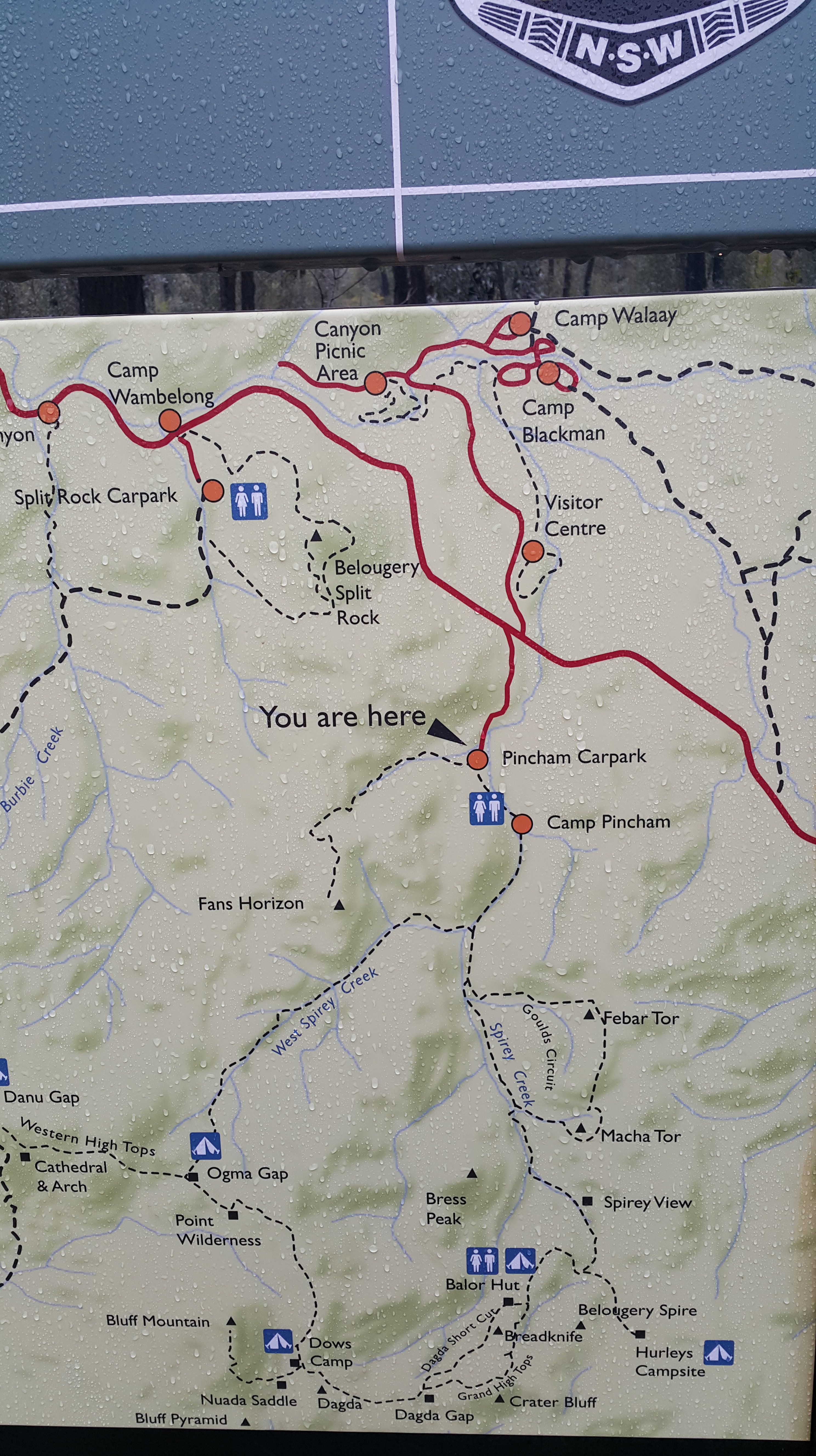 Refusing to be discouraged, since the Belougery Split Rock walk also looked like a creekless climb, we piled back in the car, and took the short drive further along the road to the next car park. This hike wasn’t signposted as closed, just with a warning for the previous day’s snowy conditions. We wouldn’t attempt the loop, though, since this showed creek crossings would be required on the way down the other side.