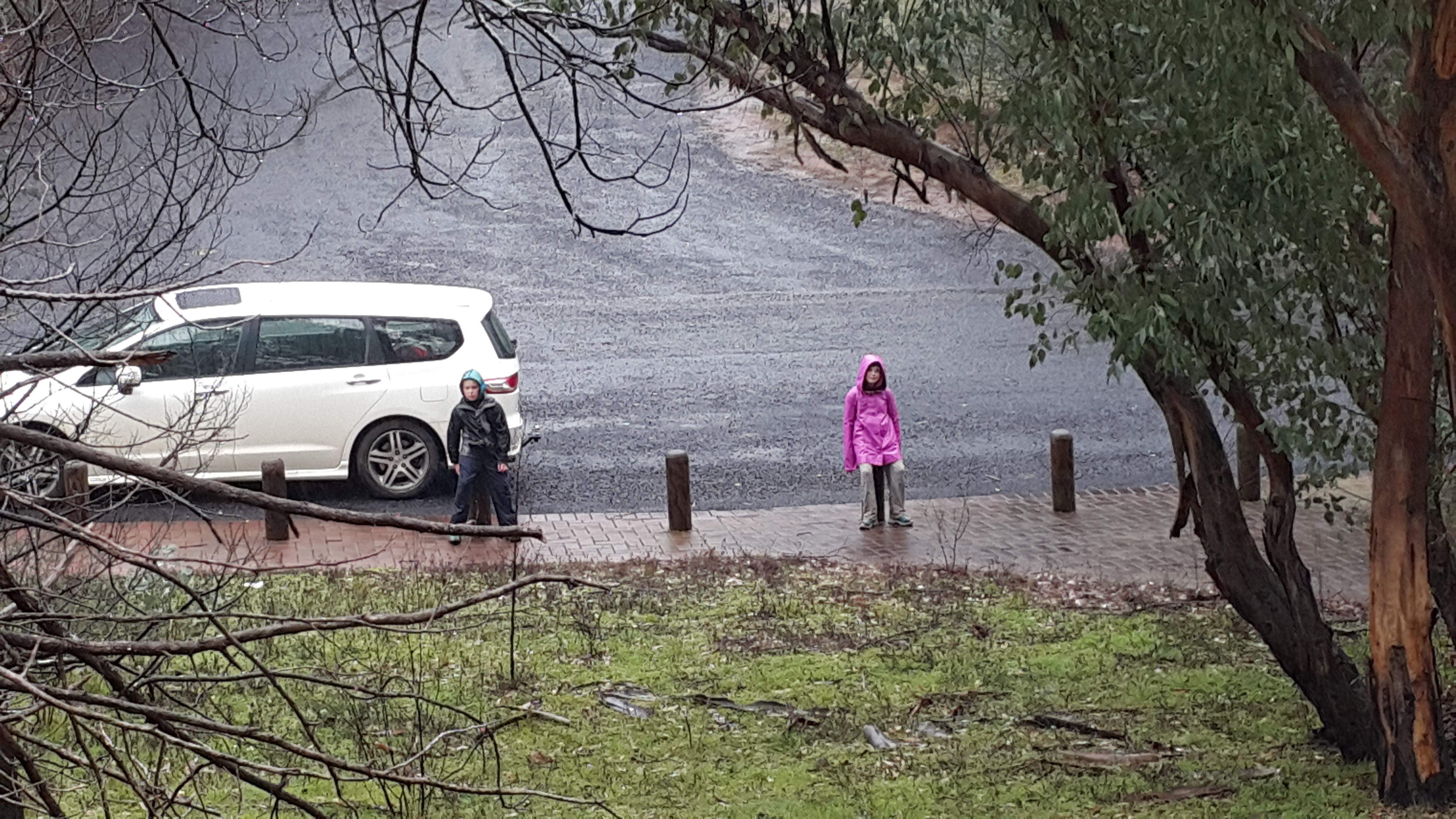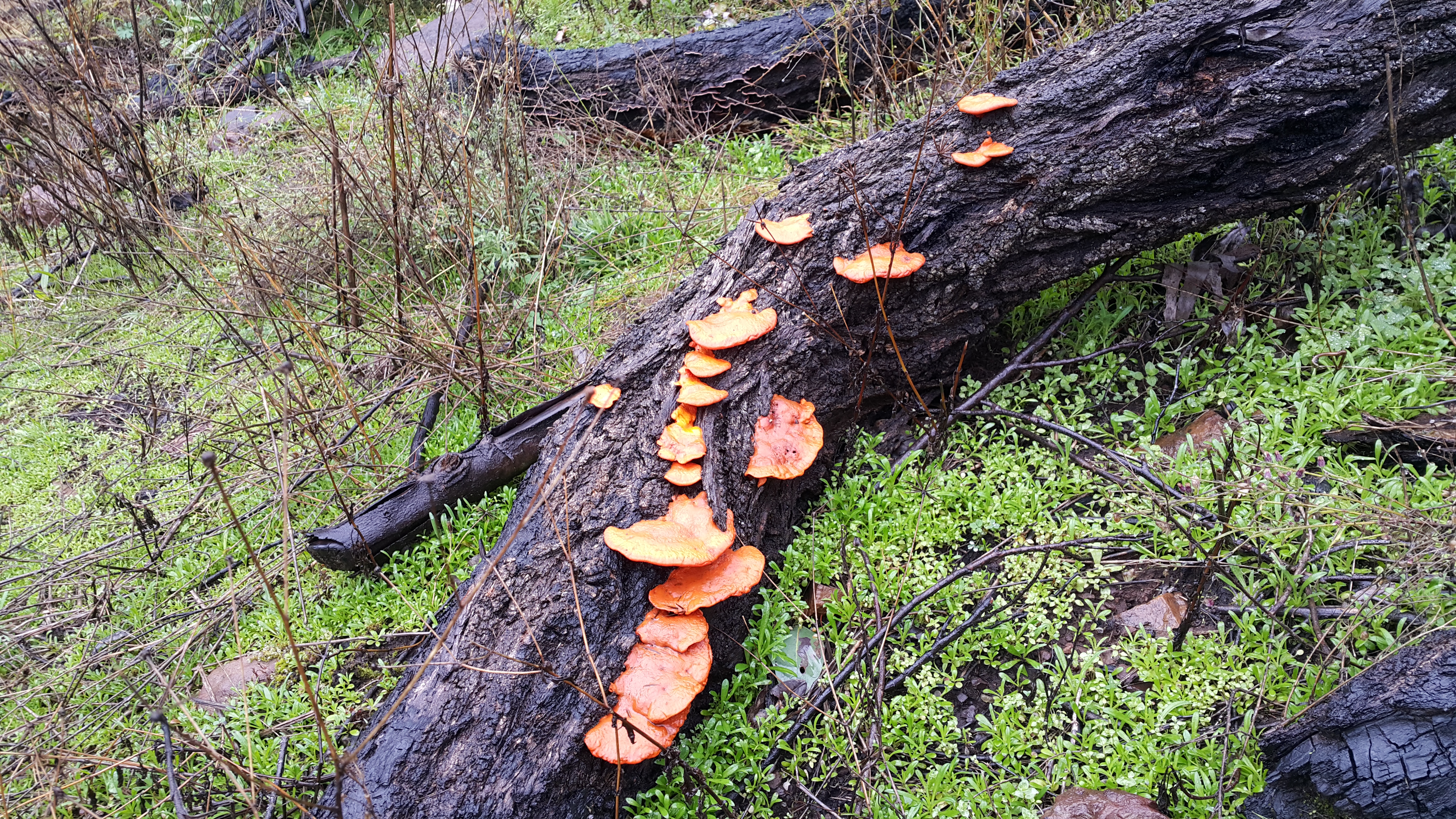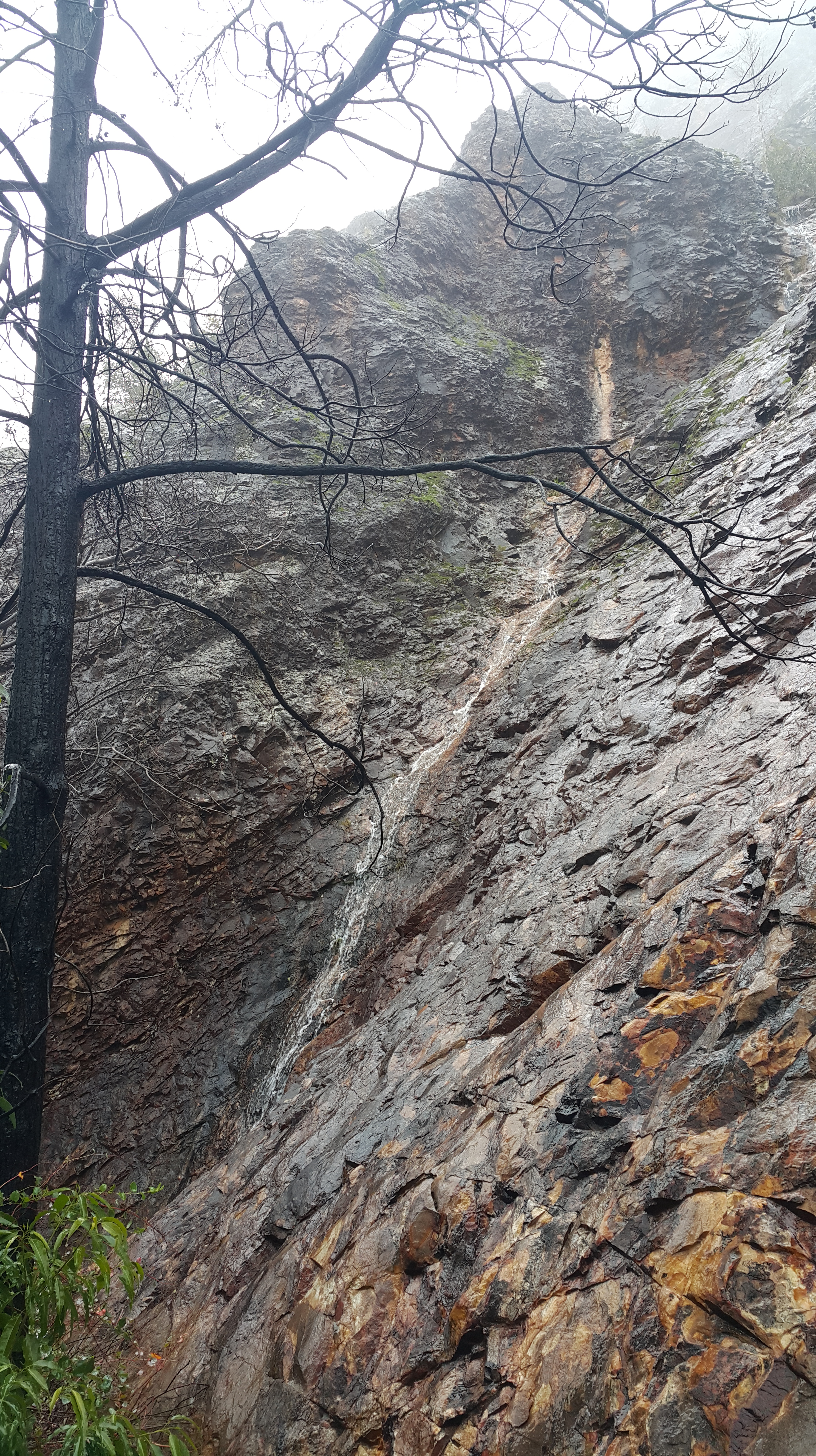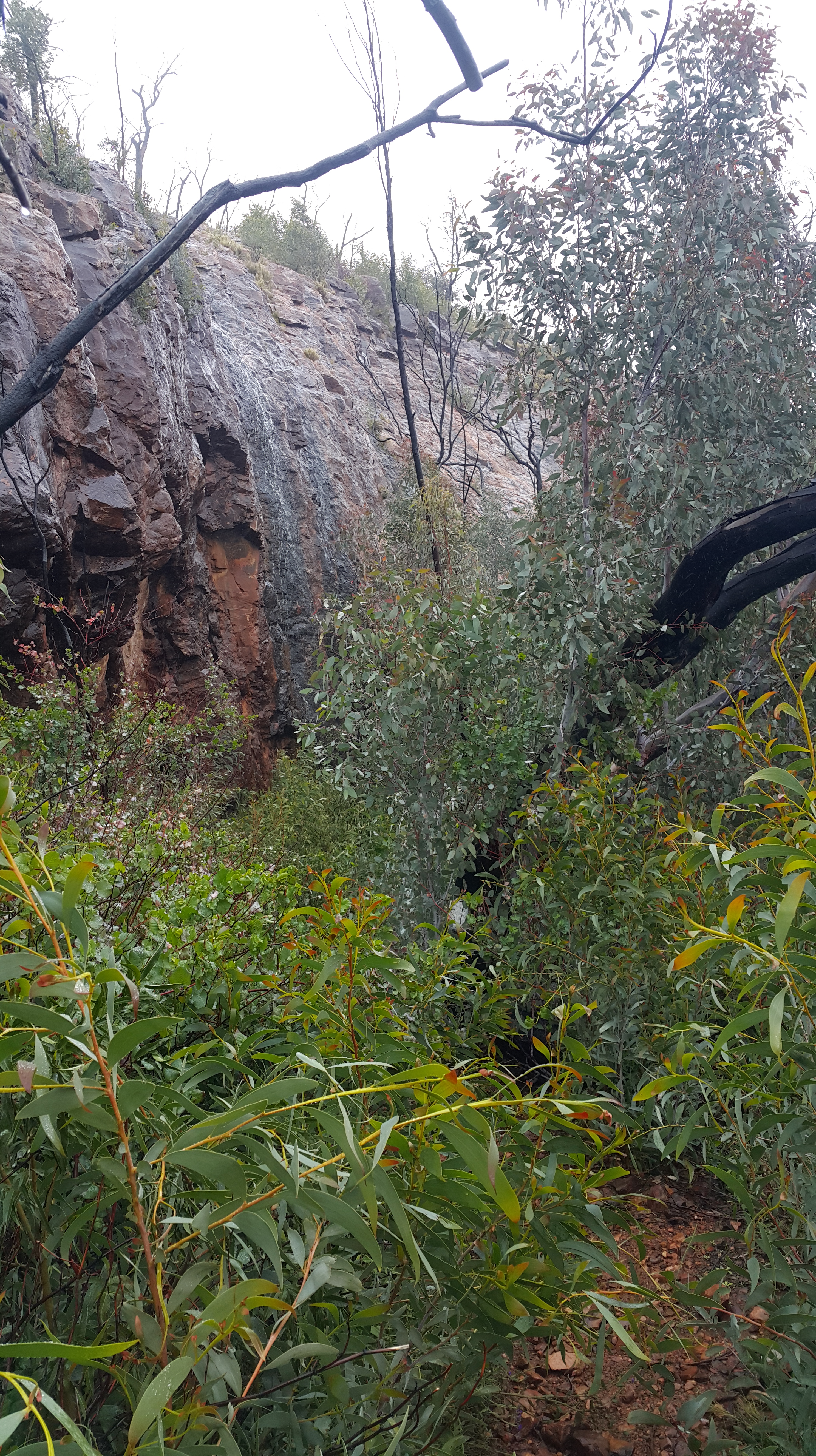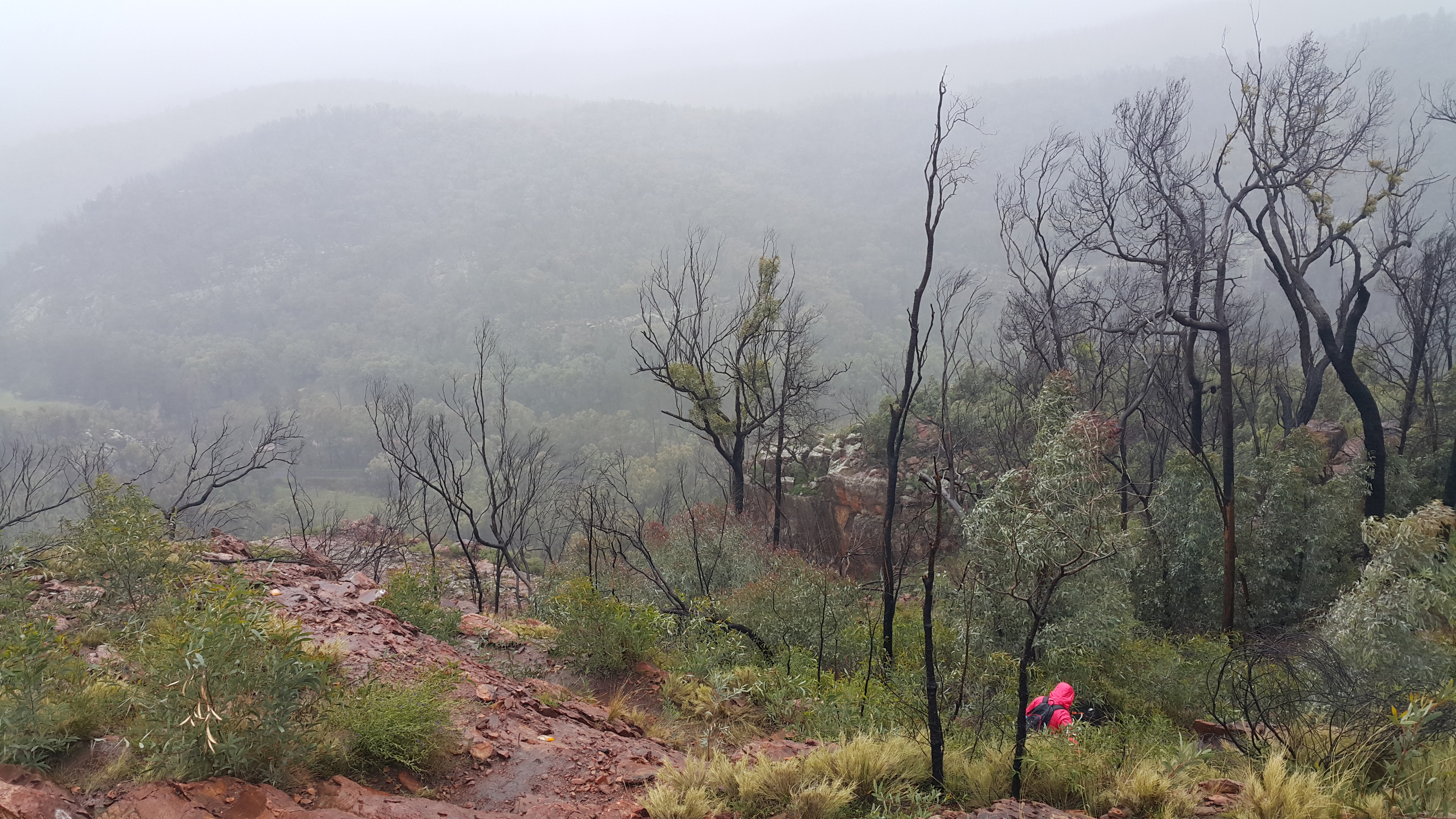 Promising the family that we’d only go out in the elements for an hour or so, we started up the slope, with a further bargain of “we’ll turn around once we’ve seen five cool things”. Despite the constant drizzle, the dripping wet regrowth flopping into the path which drenched our pants even more rapidly, the intimidating whistle of the wind as we rounded the knoll on the exposed North-facing ridges and the limited visibility, we actually had a pretty good time! Impromptu waterfalls, red fungi and naked-limbed blackened trees led to the “cool thing” count being easily reached. The weather didn’t lend itself to frequent photographic opportunities. But here’s a sense of the experience: