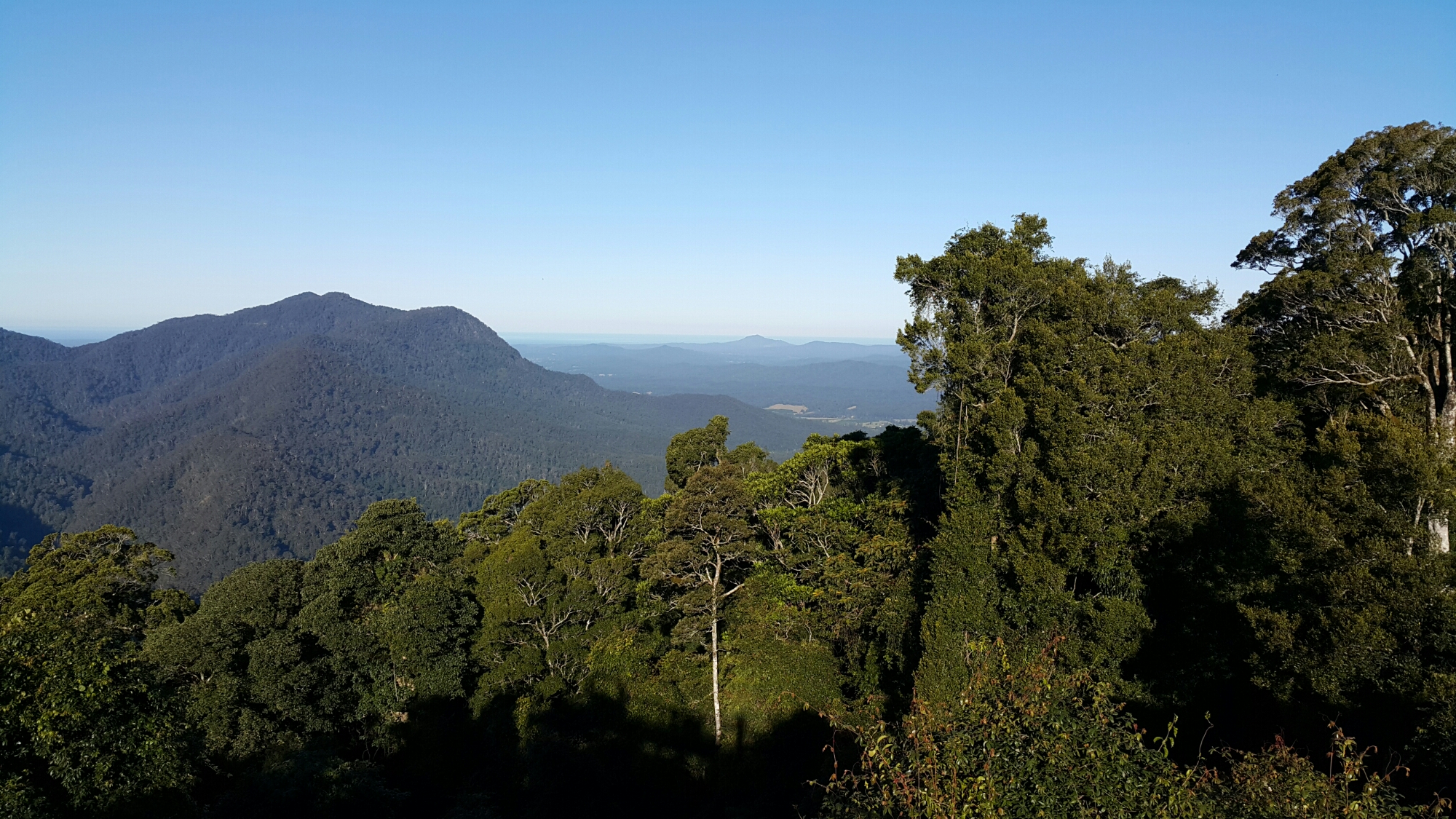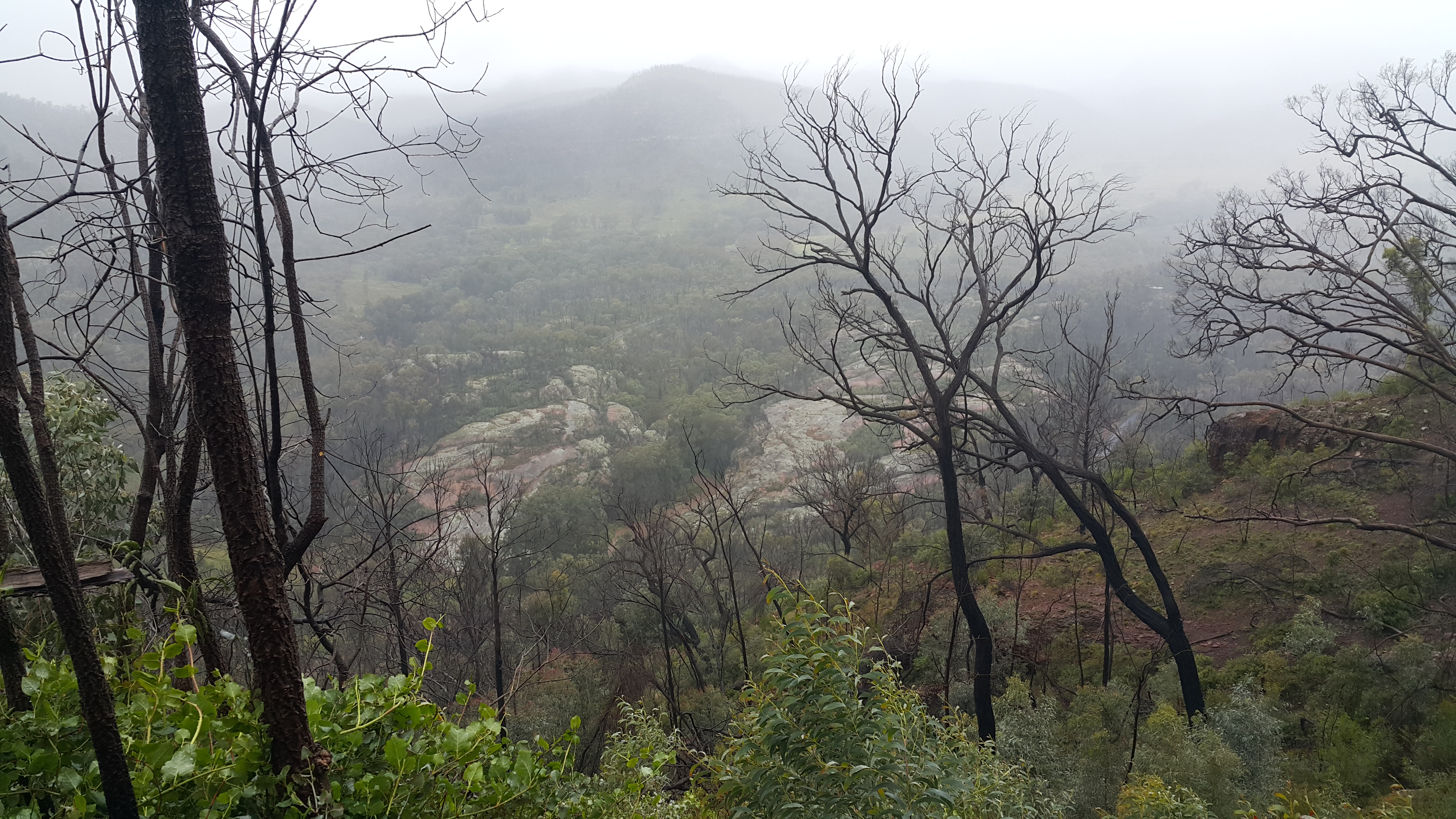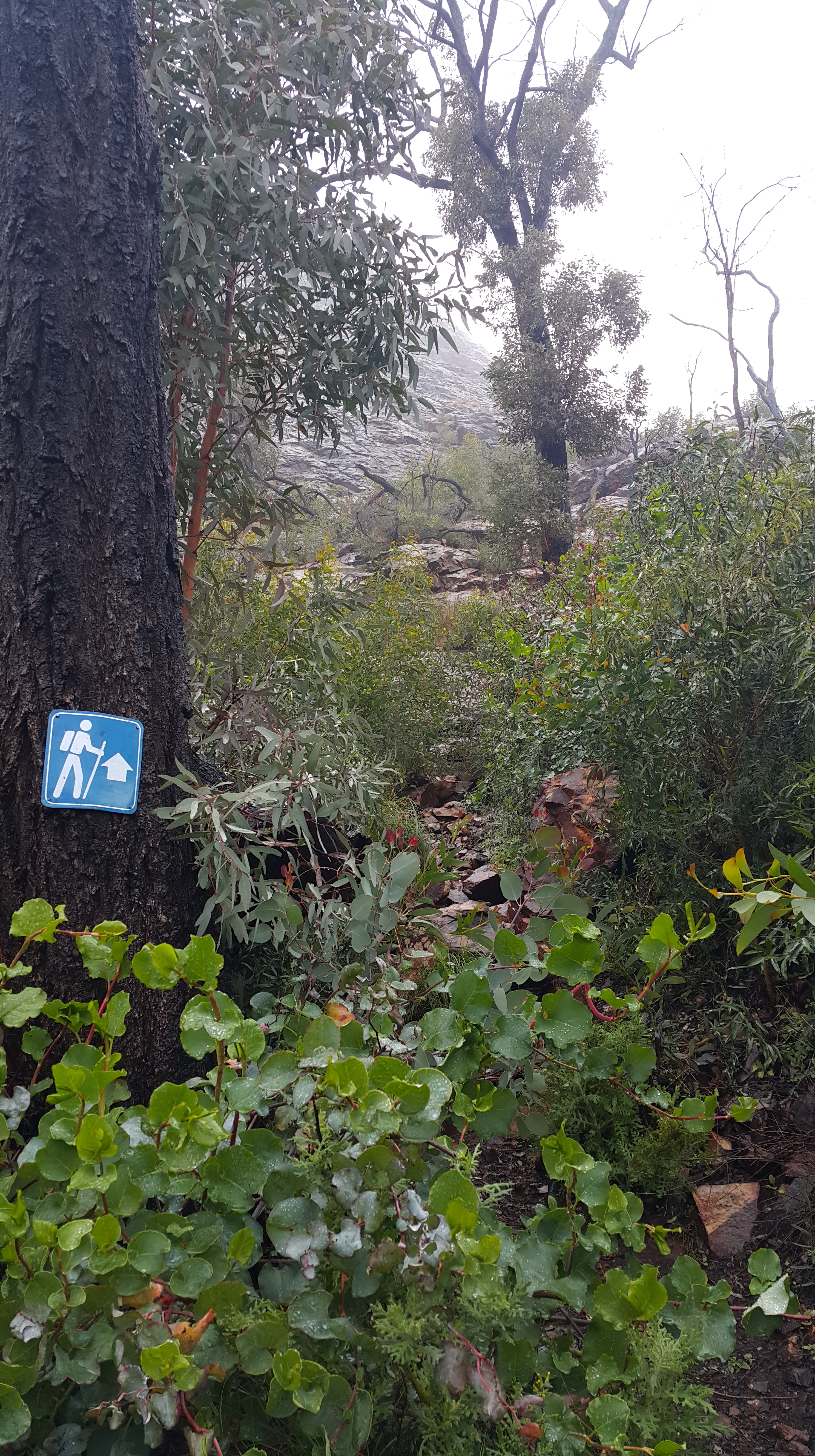 But we were suited up now, and the map promised a nearby alternative, with no creeks, up to the Fans Horizon lookout. Alas, the trail was signposted as closed, due to instability caused by the recent-ish bushfire that had been through the area.