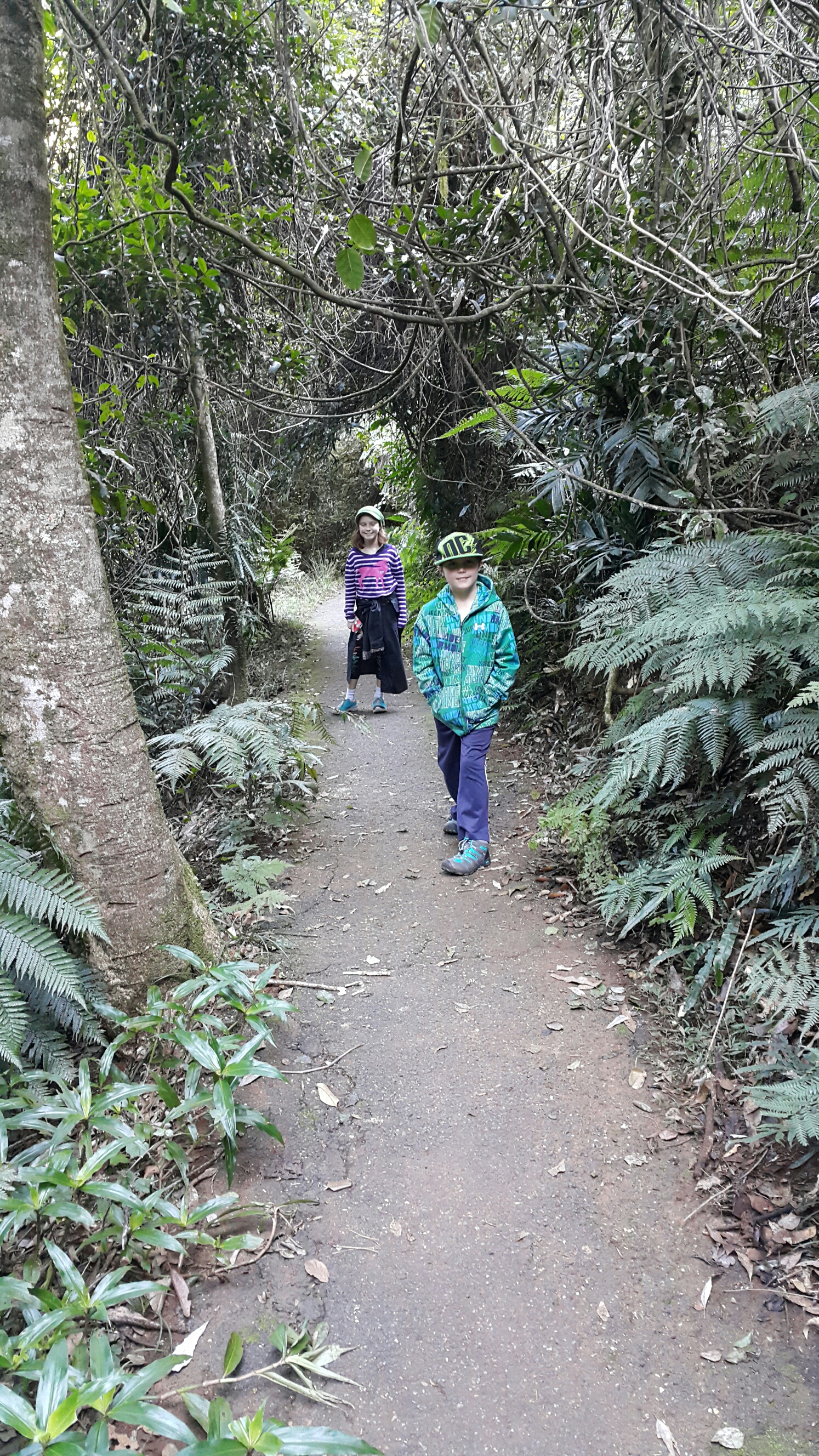 After getting our wet weather gear and back packs on, a couple of hundred meters along the track we discovered another creek blocked our way with muddy water sluicing down and over the only likely crossing spot. Despite N’s keenness to try to balance her way across either the peeking rocks or a slick-looking fallen tree branch, visions of fishing dirty, cold and soaking children out of the creek did not appeal, and I insisted we turn back.