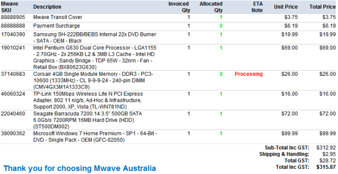 Note the red processing status next to the memory module. Apparently, this means that they are in the process of ordering this part from their suppliers. That’s pretty impressive visibility of status. Looks like everything else is in stock at mWave already, and will ship as soon as the memory arrives.
